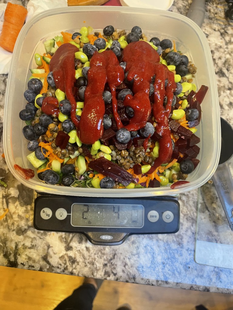 I was going to write about my daughter and protein and how we are ensuring the little picky eater is getting her protein every day, but I thought this would be more helpful and maybe insightful. Today, with all the toppings, my salad was over 2 pounds.